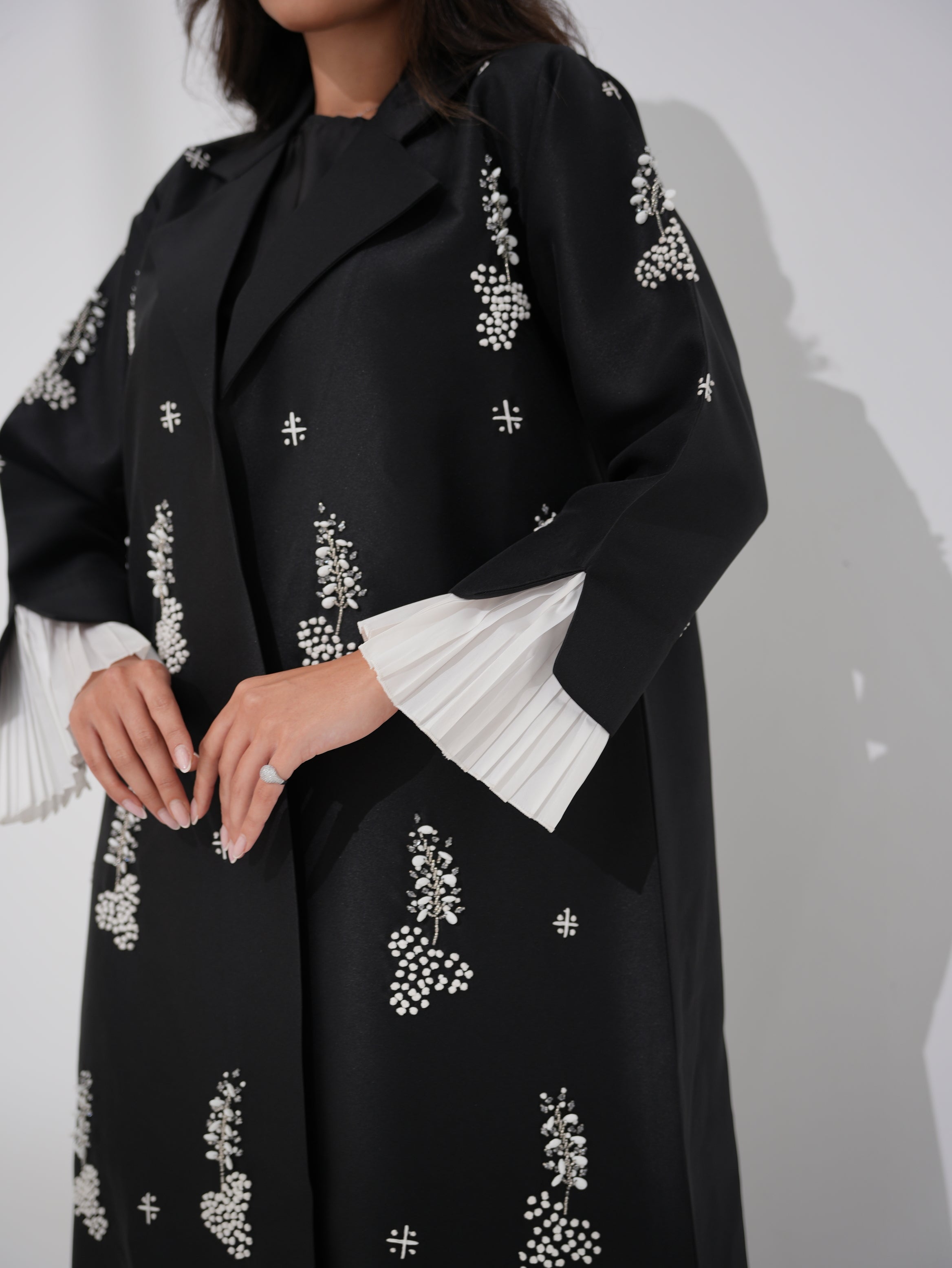 Indulge in luxury with our Mira Abaya, featuring a sleek black design adorned with intricate white threading. Elevate any outfit with this elegant and exclusive piece. Allow the intricate details to speak for itself and embody the essence of sophistication.